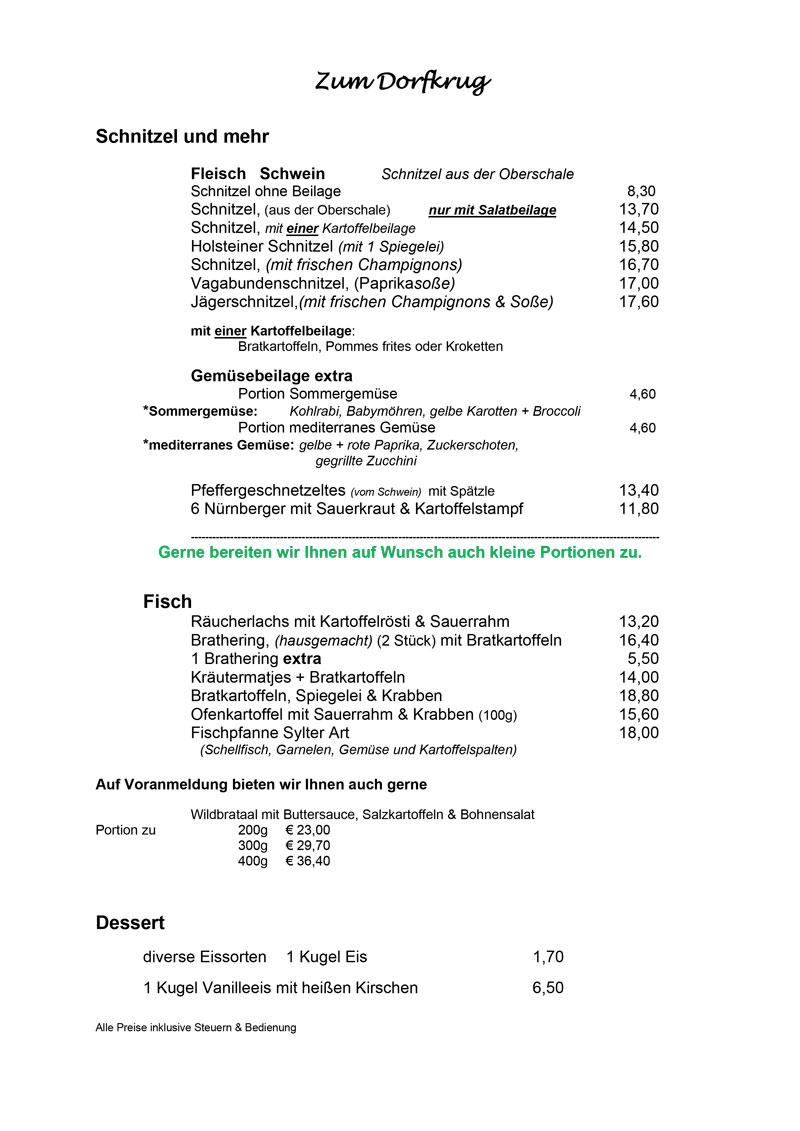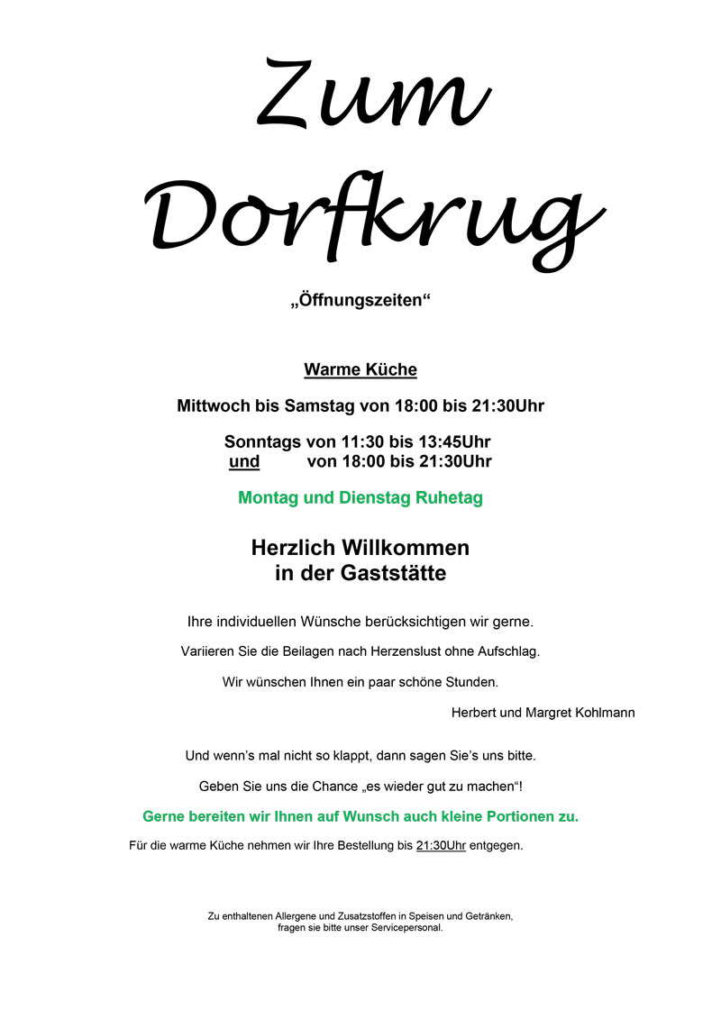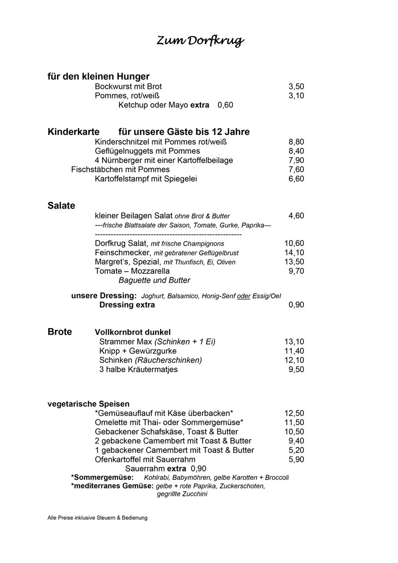 Herzlich willkommen in unserer Gaststätte „Zum Dorfkrug" in Bremen Borgfeld! Wir verwöhnen Sie abends mit abwechslungsreicher deutscher Küche. Sonntags können Sie aus unserer Mittagskarte wählen. Lassen Sie es sich in gemütlicher Atmosphäre und einem freundlichen und sonnigen Ambiente bei uns gut gehen.